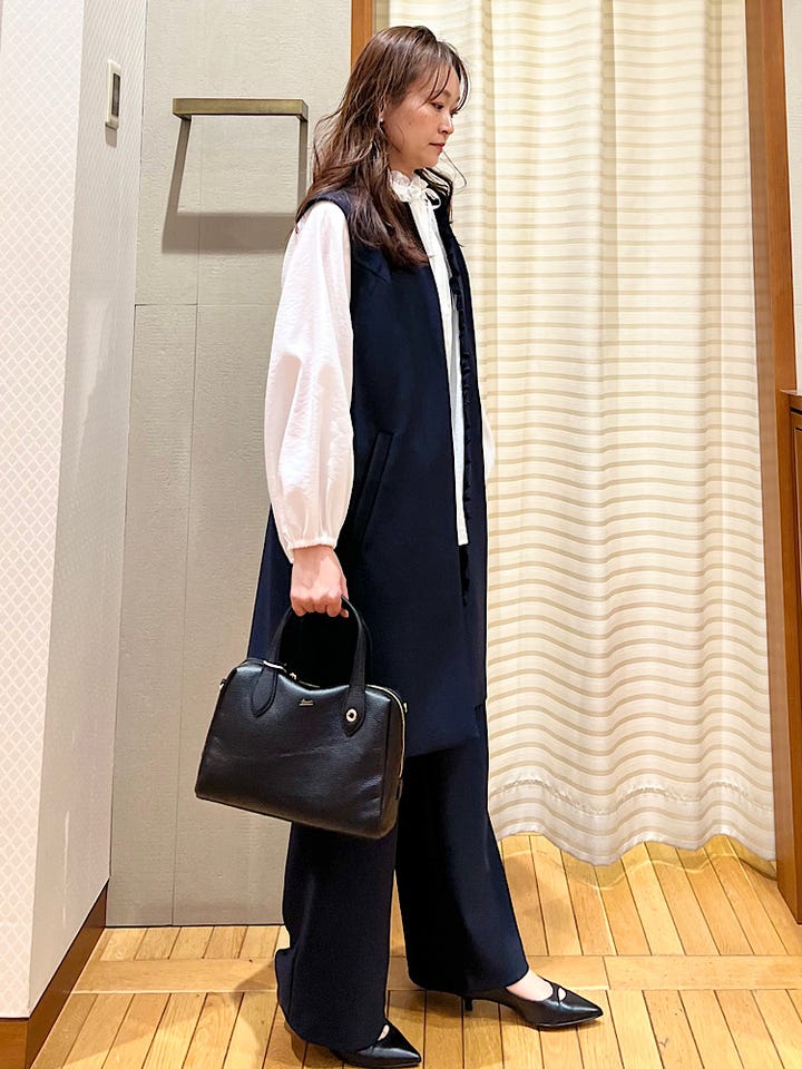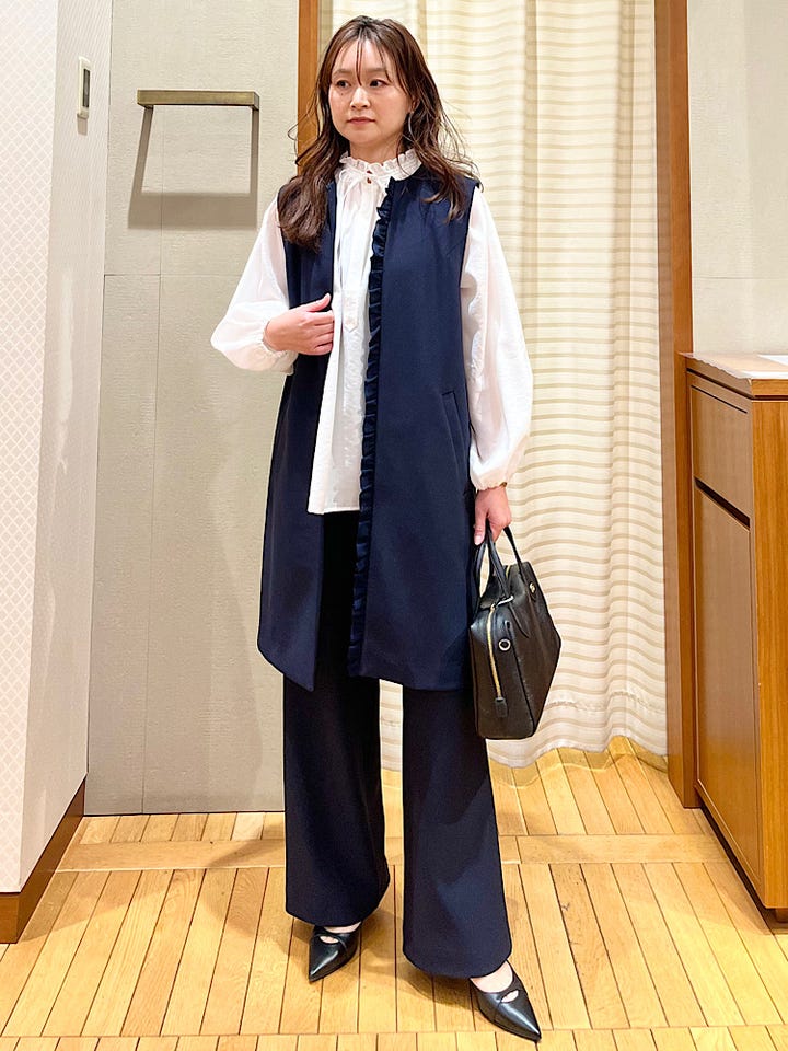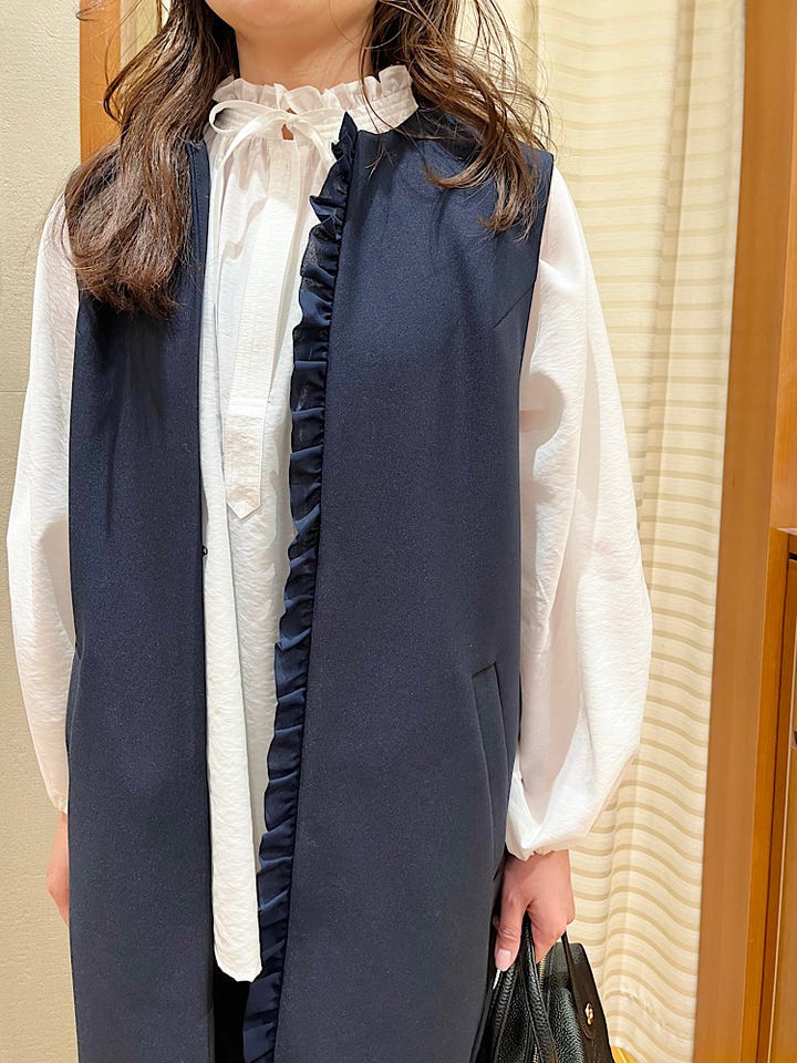 着心地:ロング丈のジレで落ち着いた雰囲気で着れる