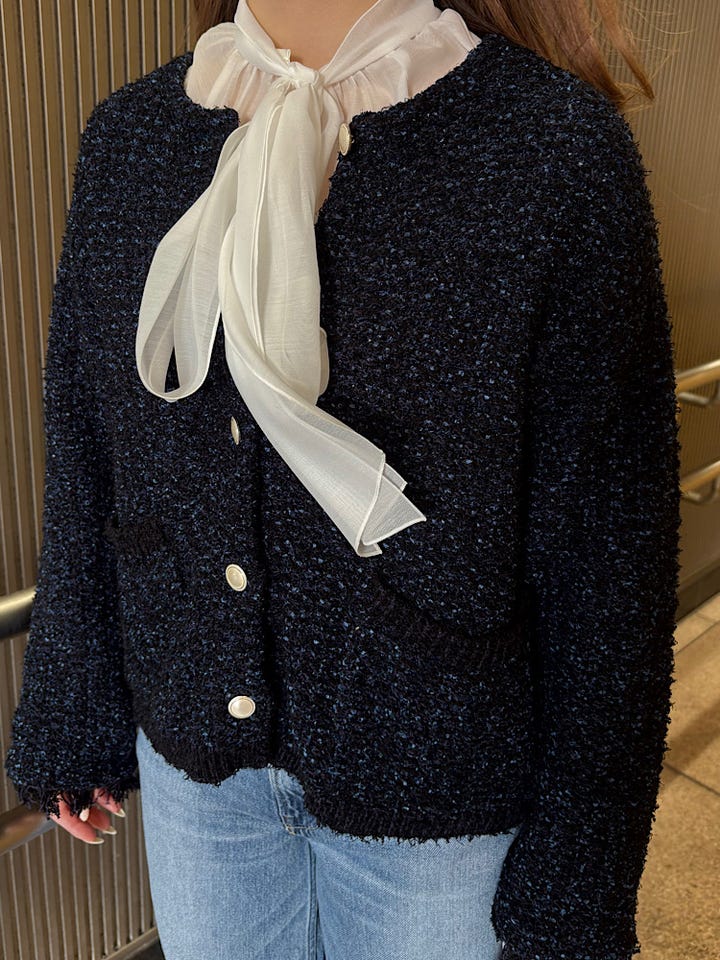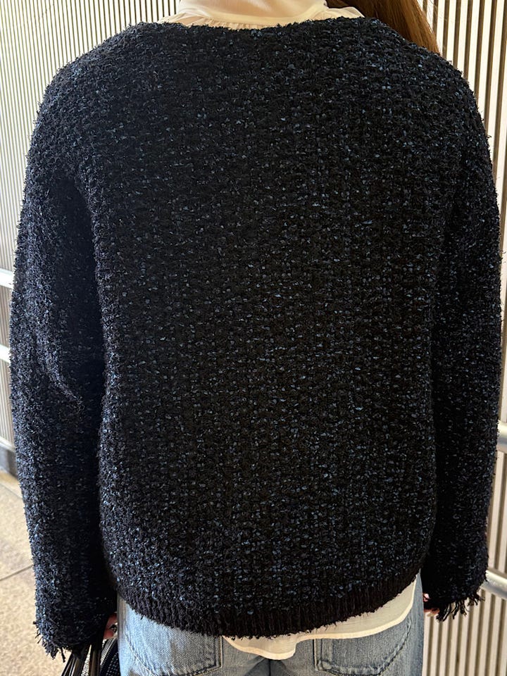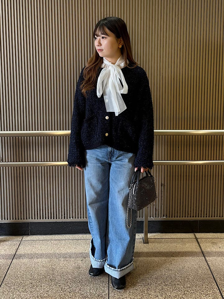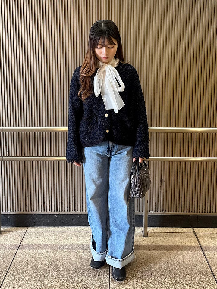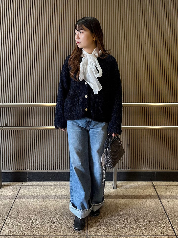 着心地 : ゴールドボタンがアクセントになり程よい綺麗め感。デニム合わせや綺麗めボトムと合わせてオンオフで着用可能。