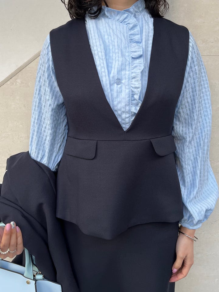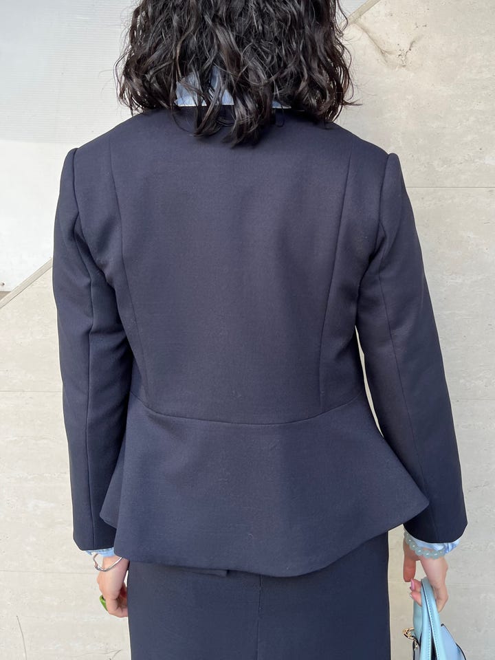 昨年から人気のワンピースです!セレモニーシーズンが近付いているので、きれいめなコーデを組んでみました。ペプラムのデザインで、スタイルアップして見えますし、私自身普段バストとヒップが気になるのですが、問題なく着れるサイズ感でした。ジャケットを合わせるとしたら、写真のようなペプラムがちょうど隠れるくらいのものだとバランスが取りやすいです。