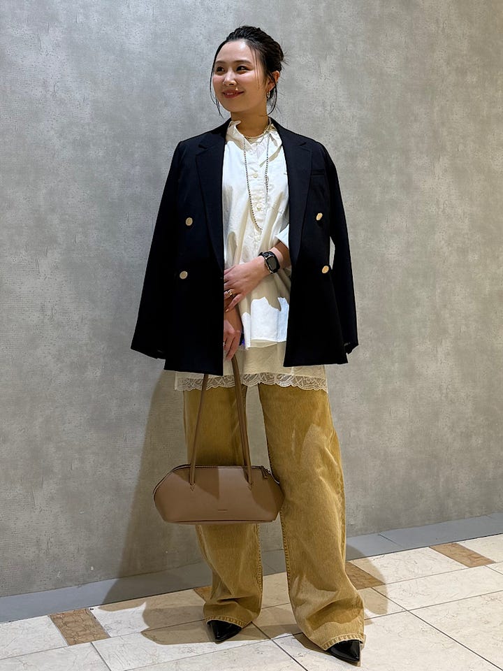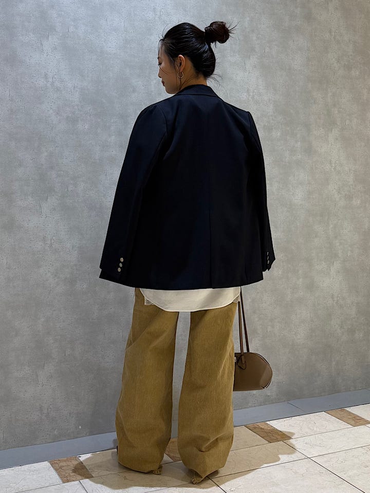 着用感 : ジャケットを羽織るだけでコーディネイトがぐっと引き締まります。身幅が広めなので厚手のトップスの上からでも着用いただけます。生地は濃紺で少し暗め、金ボタンはマット仕様なので全体的に落ち着いた印象になります。