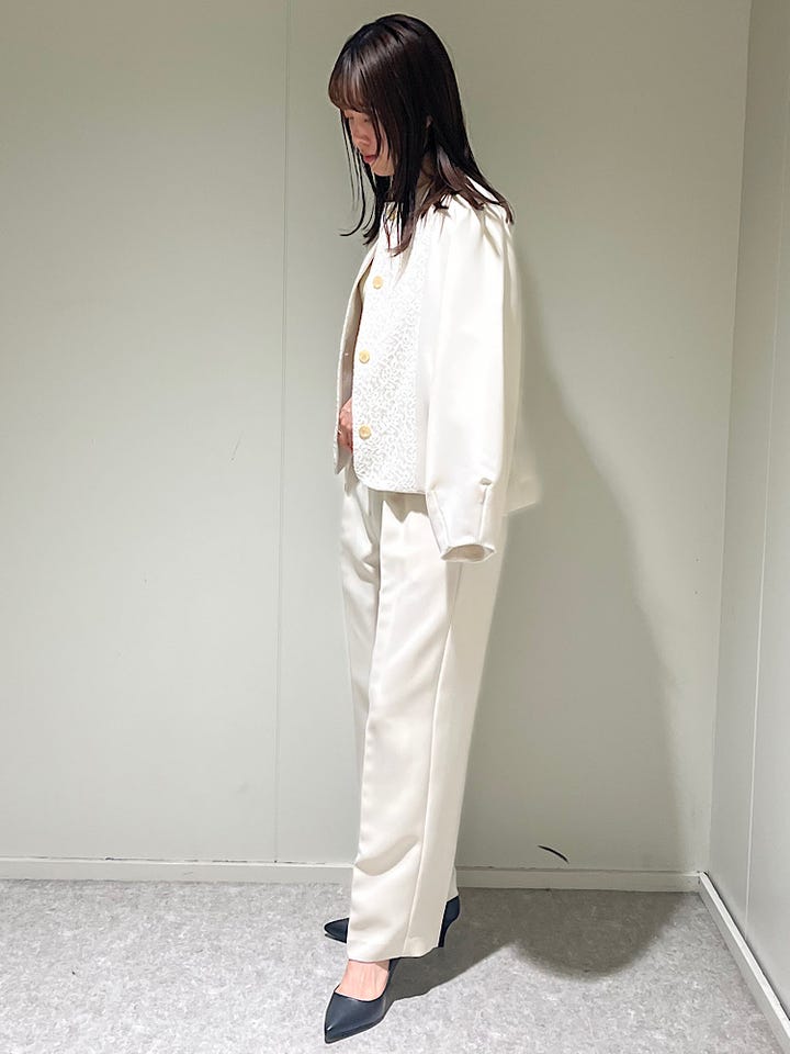 フロントレースの装飾がさりげなく上品な印象のジャケットになっています。ノーカラーで首元すっきりしているので襟付きのブラウスと合わせるのも可愛いです。インナーはシンプルにジャケットは閉じてセットアップで見せる着こなしもカチッと感がでておすすです。
