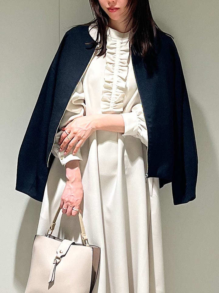 軽い着心地のブルゾンでやや丸みのあるコクーンシルエットになっています。着丈は長すぎないのでワンピースの羽織にも合わせは万能なアイテムです!オンオフ兼用できるので春に向けて是非チェックしてみてください。
