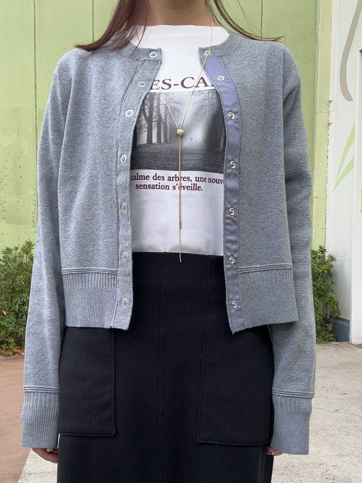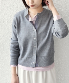 リングボタンカーディガン。?シャリ感のあるニットで春先にぴったりな素材。?ぴったりめなサイズ感で、?カットソー一枚なら重ね着できました。?ボタンを留めて一枚着としても着られます。