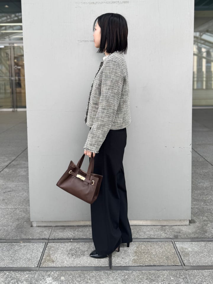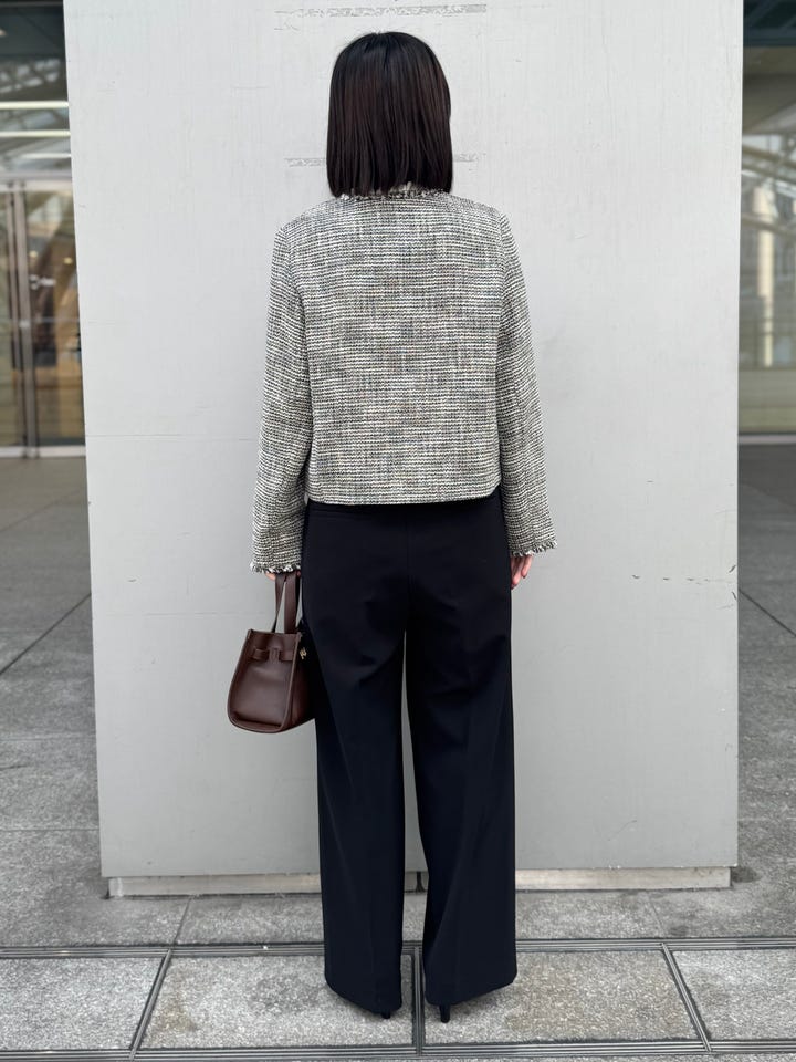 サイズ感:身幅も袖周りも程よいゆとりがあるため、ブラウスにゆとりがあってももたつかない。丈感はお尻は隠れずすっきりした丈感。
