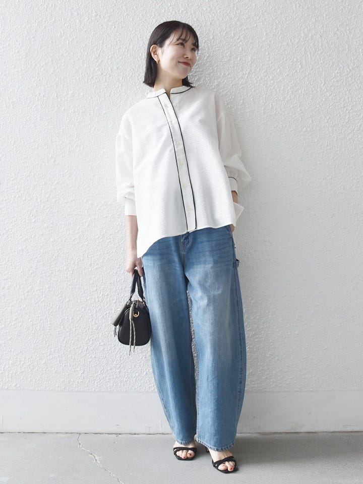 フェミニンなデザインのブラウスに、デニム合わせでカジュアルに◎