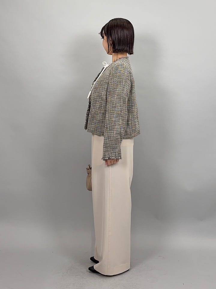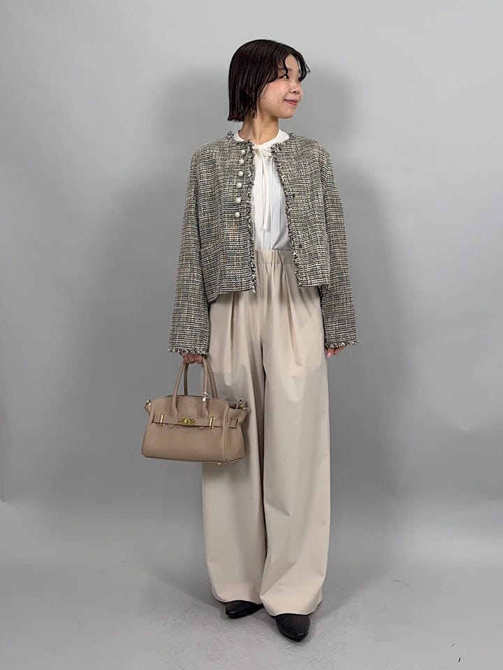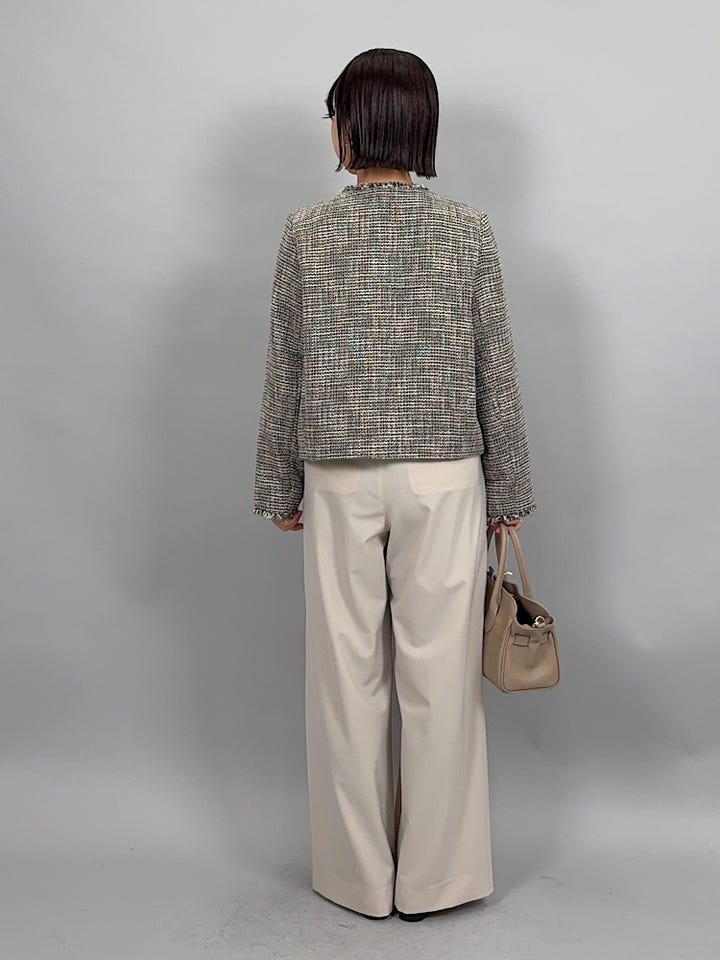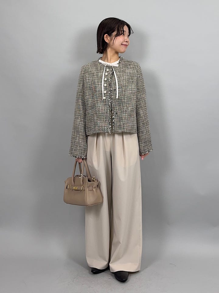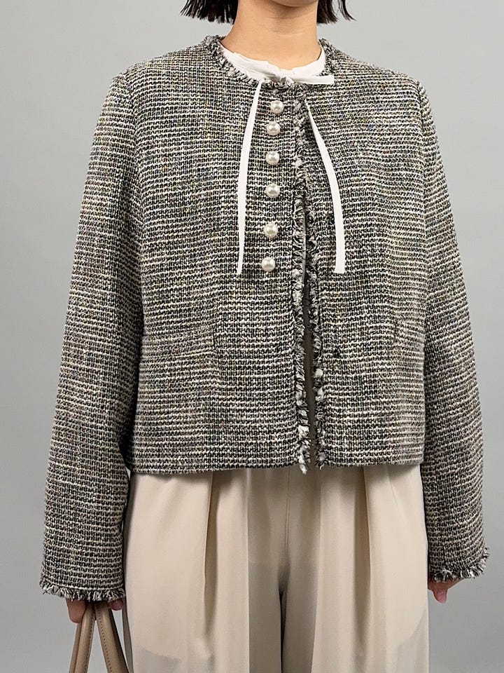 丈夫で立体感のあるツイード素材。丈夫ですが、やわらかく軽やかな着心地です◎ホック開閉なので、開けた時もすっきり綺麗に着ていただけます。パールボタンが綺麗なので、アクセサリーなしでも華やかに合わせていただけます。