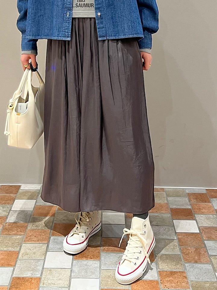スカートにみえてパンツです◎コンパクトで畳めて場所を取らない、サテン素材でシワになりにくいので、旅行やお出かけにも使えそうです!光沢感があり、綺麗めな印象がだせます^_^