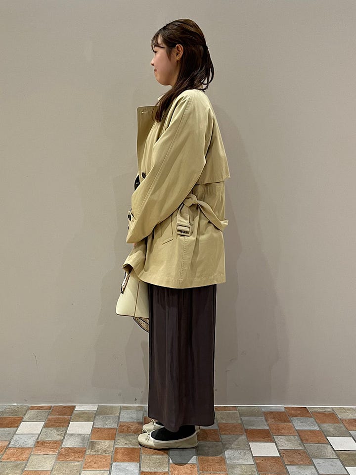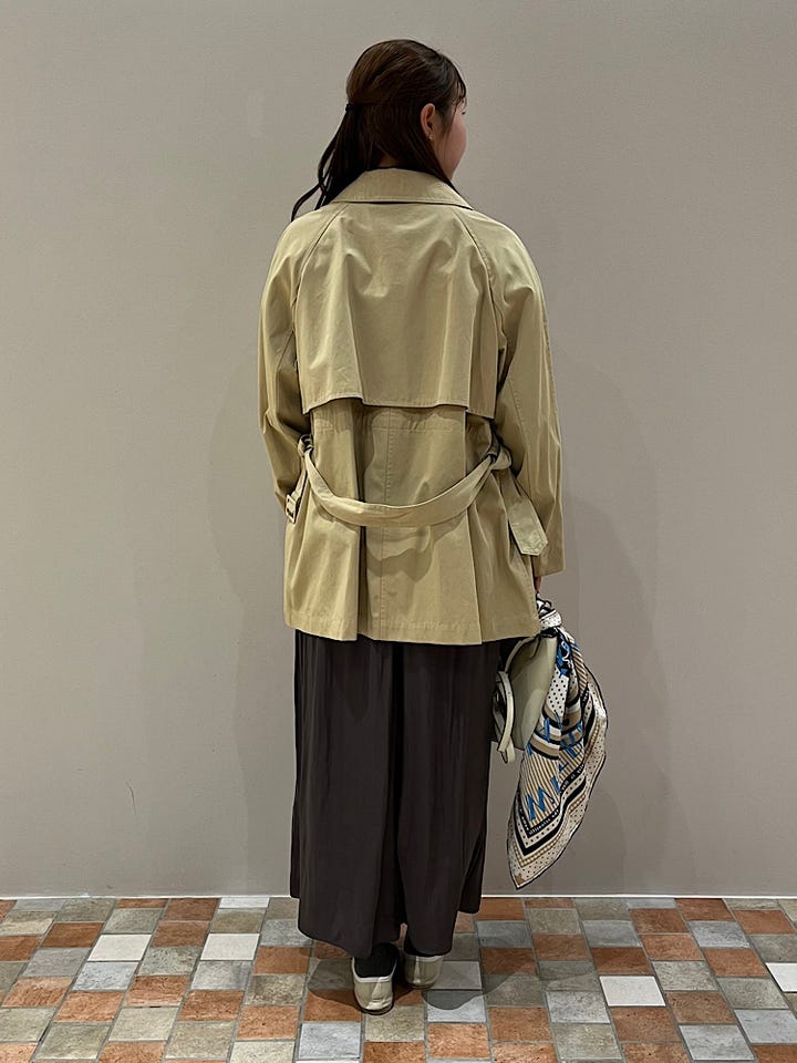 ミディ丈なので、どんなボトムスでも合わせやすいです◎後ろはドロスト仕様になっていてシルエットも変えられます!ゆったりしたサイズ感で、お仕事や普段用に使えてこれからの季節のアウターとして重宝します^_^