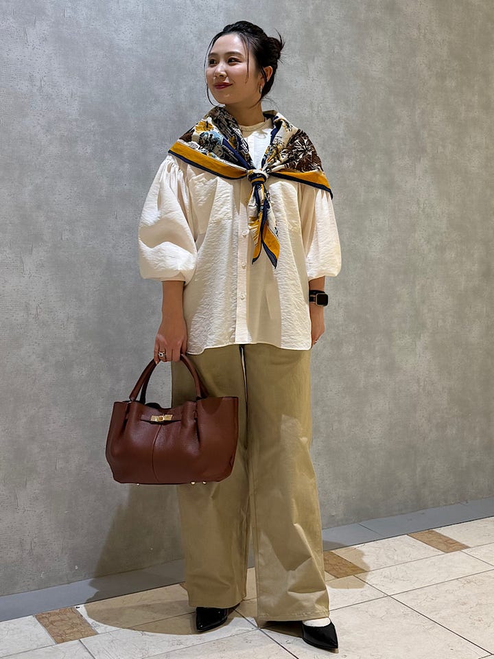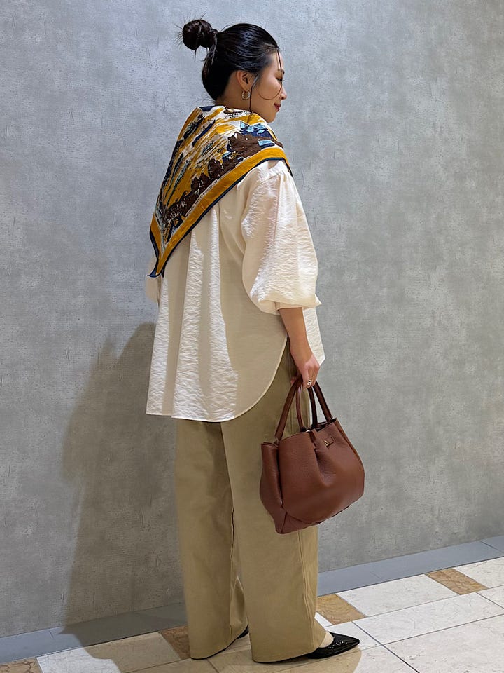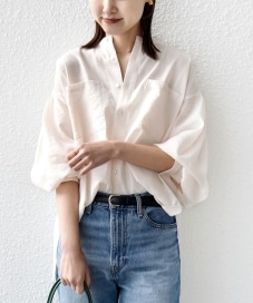 着用感 : 身体のラインを拾わない立体的なシルエットのブラウスです。着丈は前後差があります。オーバーサイズなのでボトムにインするとよりスッキリ、インせずともスリットが入っているので大きくは見えません。カジュアルから綺麗めまで幅広いコーデにご着用いただけます!