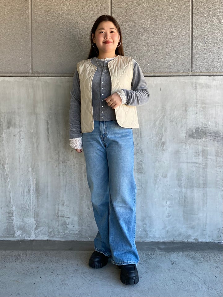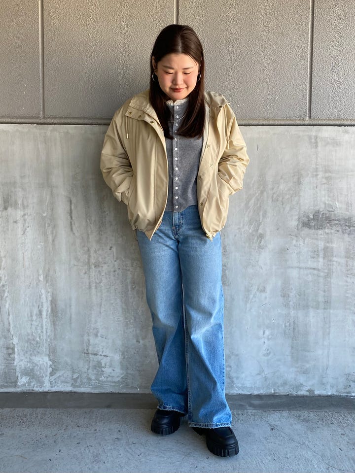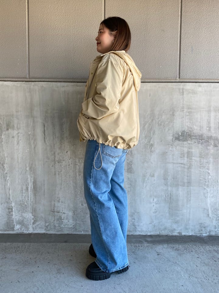 着心地:新型ミッドライスのルーズブーツカットモデル、「LOOSE BOOT」が登場。 脚を綺麗に見せてくれるシルエットです。Lサイズを着用しています。裾の長さは156cmだと下に付くので、厚底のシューズを履くのがオススメです。