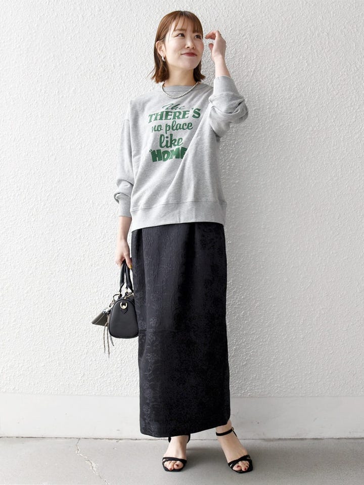 きれいめスカートにロゴスウェットを合わせたカジュアルコーデに◎