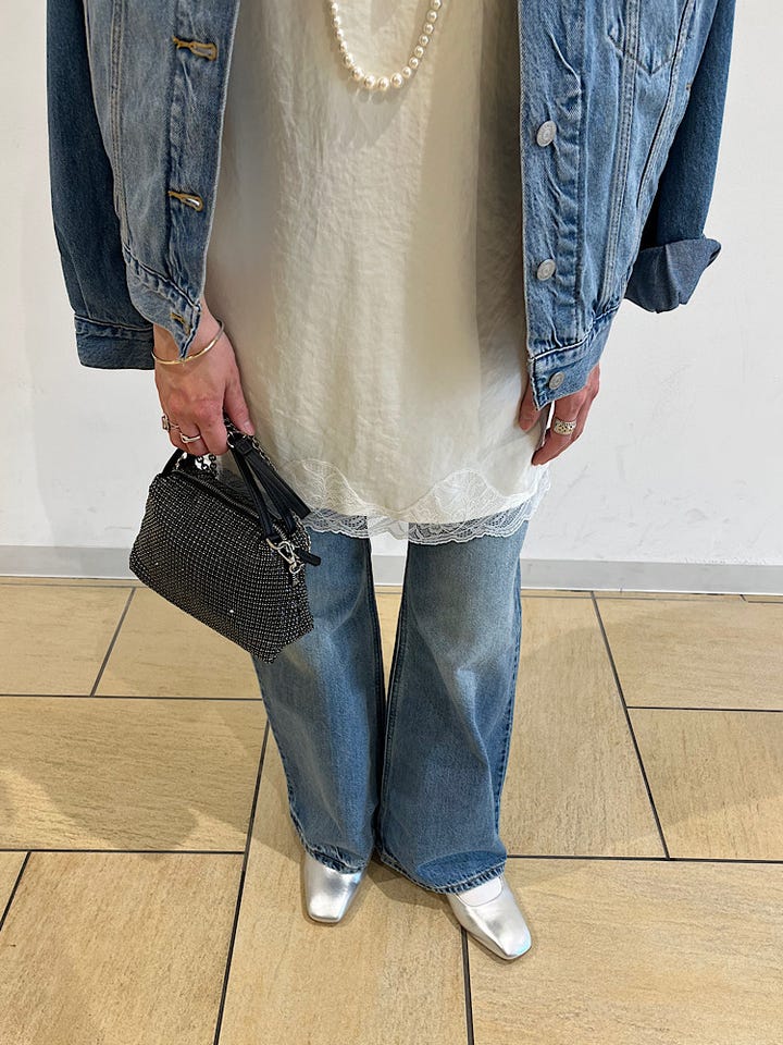 着心地:伸縮性はない生地。カットソーなどに重ねると可愛いです。