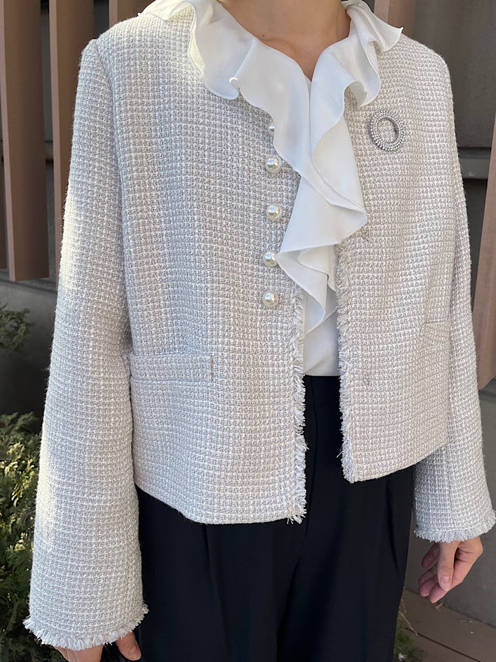 〔36〕《一部追加予約》トライスピン 杢 ツイード パール モチーフ ボタン ジャケット(セレモニー対応可)