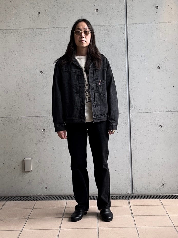お出掛けやデートにお使い出来るコーデ提案です。リーバイスのデニムのセットアップ。幅広くお使いできる万能なセットアップです。参考にいかがでしょうか。