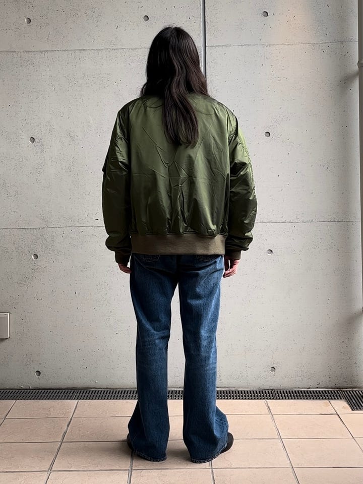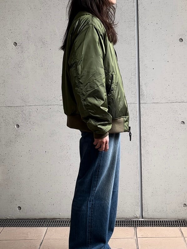 お出掛けなどに活躍してくれるコーデ提案です。ジャケットはスピワック別注のMA-1ビンテージや古着好きにはたまらない一着になっています。パンツもリーバイスのデニムパンツ。ワイドシルエットなので、着心地も快適です。参考にいかがでしょうか。