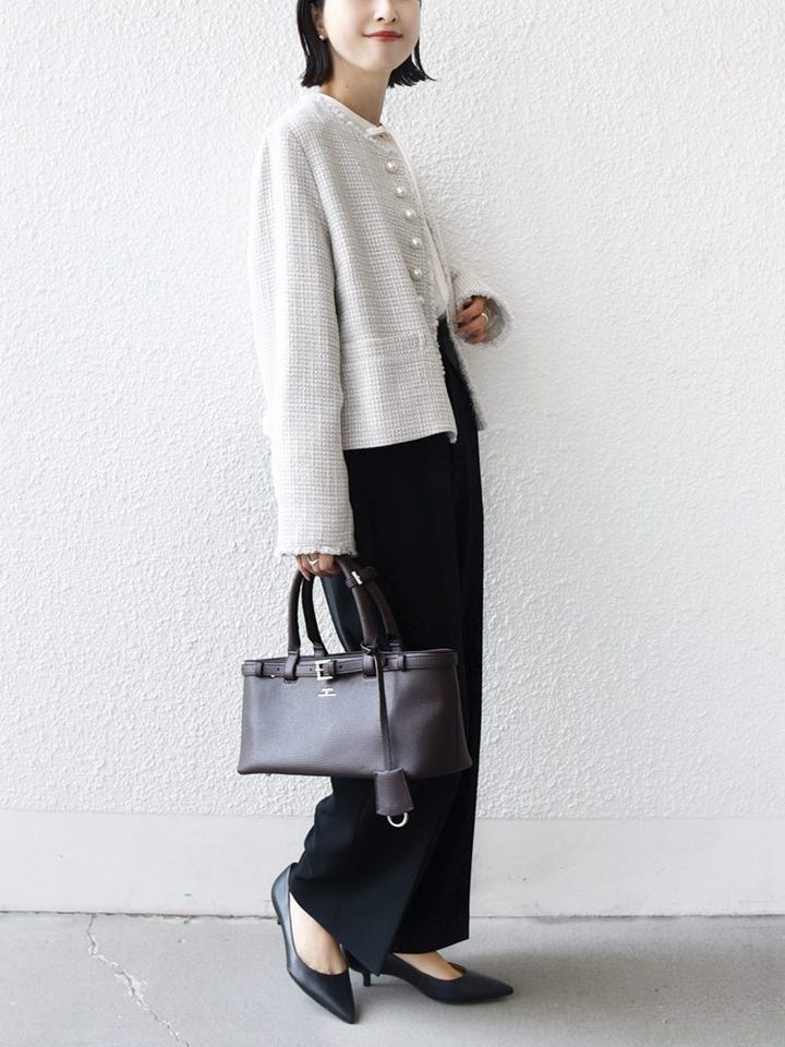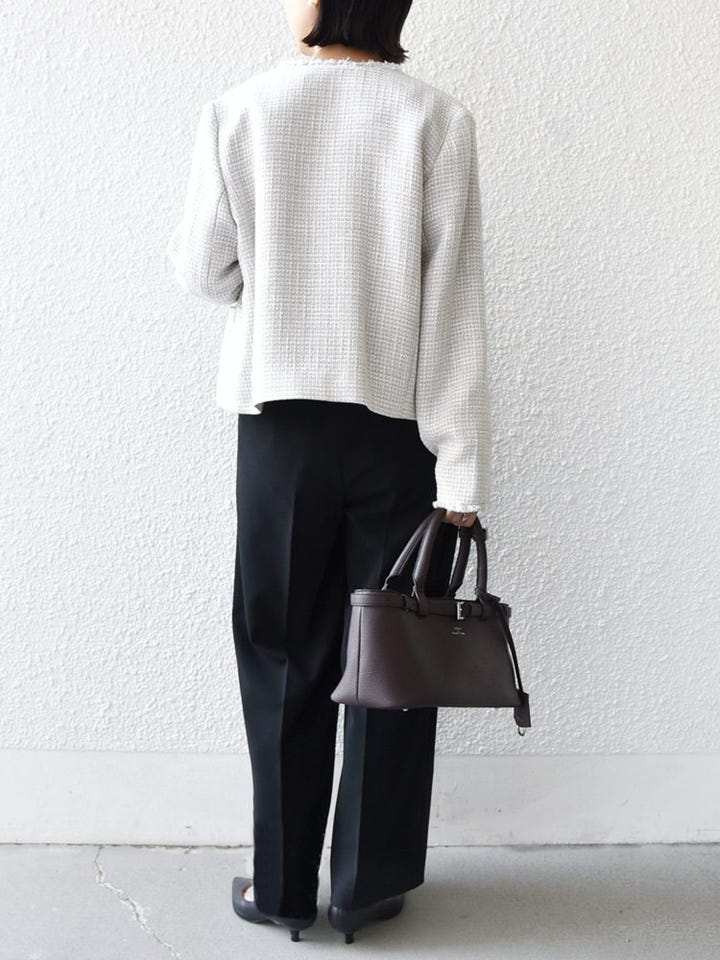 素材感:表面にポコポコとした表情があるツイード生地で、さりげなくキラッとするラメ糸が入っています。