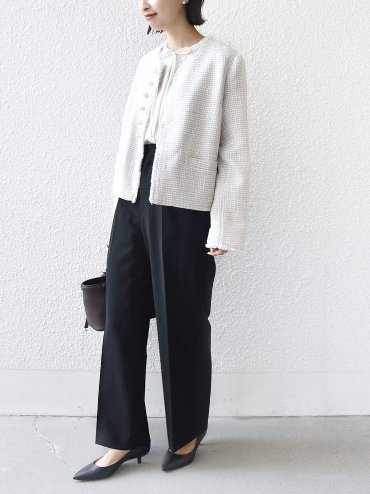 着心地:ツイードですが重たさはなく、軽やかな着心地。フロントはフックで留める仕様なので、前を開けて羽織ってもボタンホールがなく、すっきりとした印象で着れるのが◎