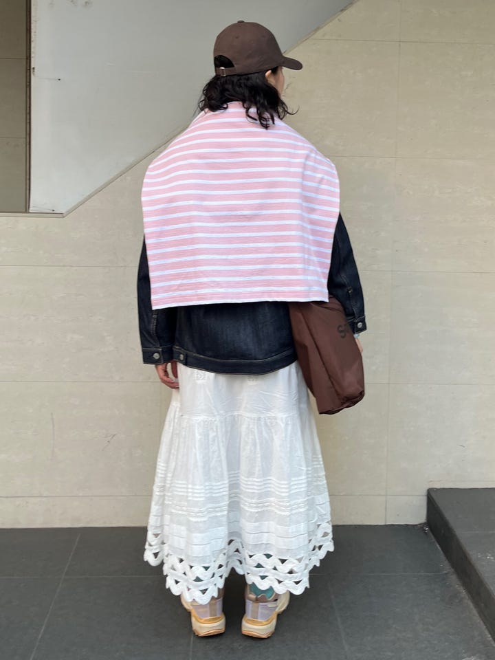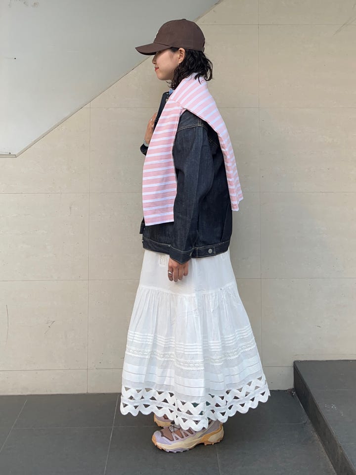 割とコンパクトなサイズ感で、着丈がやや短めです。Aラインやフレアのスカートや、ワイドパンツなどと合わせていただくと、バランスが取りやすいです。スポーティーカジュアルな雰囲気で、ボトムスも色々と合わせていただけます。