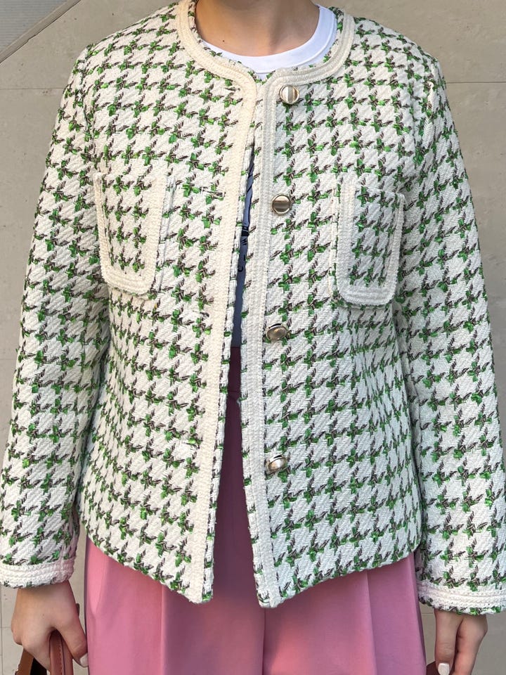 〔ONE SIZE〕SHIPS any: ツイード パイピング ノーカラー ジャケット