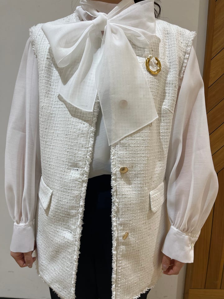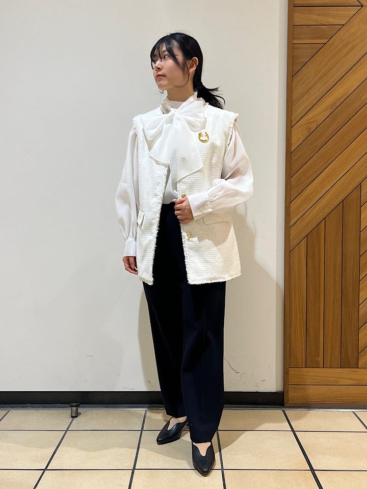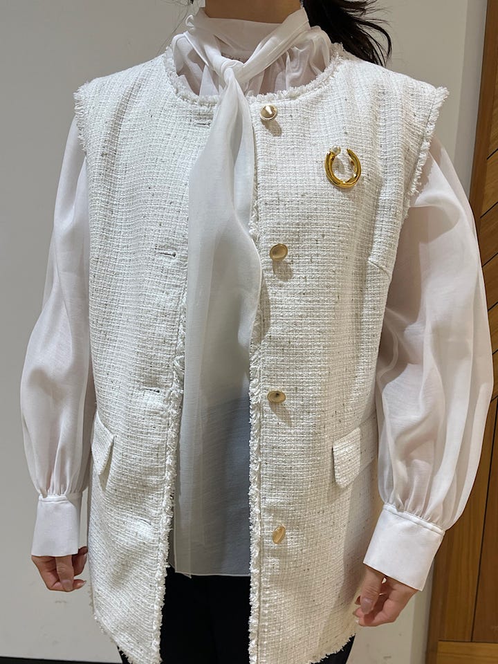 素材感・着心地:ラメ繊維が織り込まれており、金ボタン目をひく華やかなツイードジレ。
