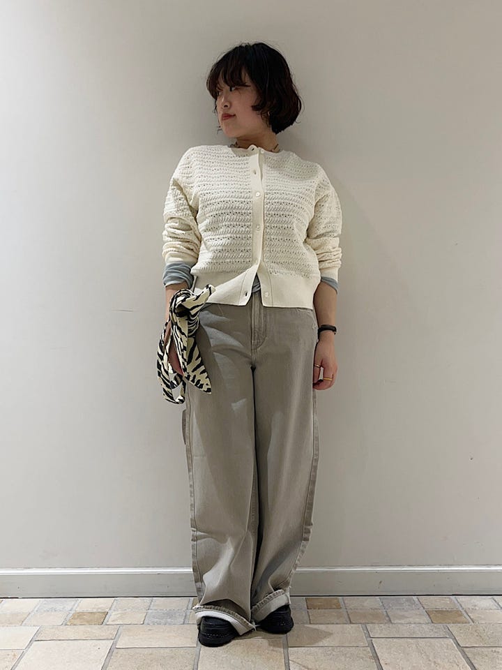 着心地:生地感柔らかく着心地良い。淡いグレーカラーで通年使いやすい。綺麗めな印象でも履いていただけます。