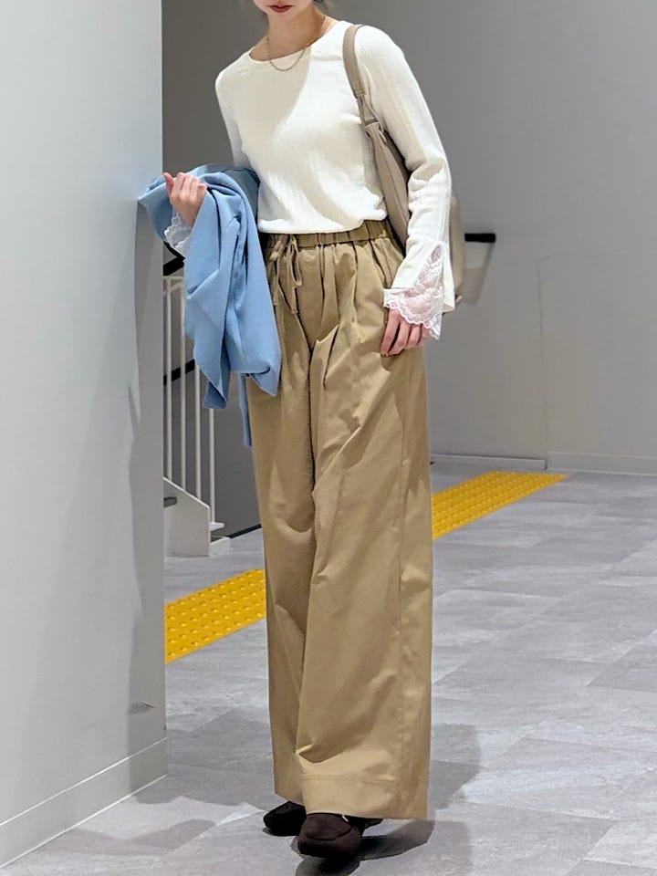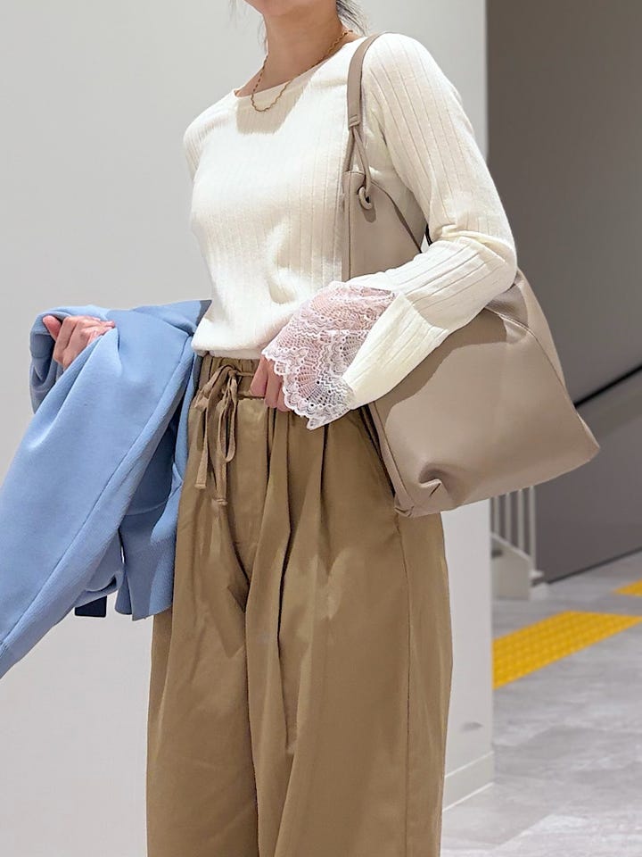 【素材感・着心地】インナーとしても一枚でも可愛く着て頂けます。トレンド感のあるレースが袖口にドッキングされており、沢山着回しを楽しんで頂けそうです!