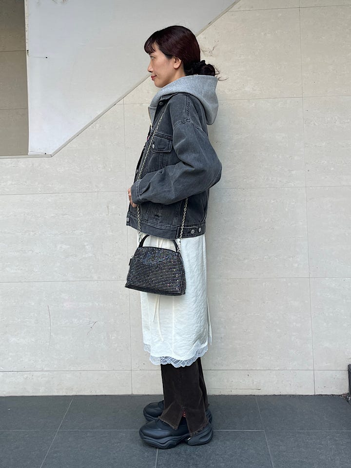 着心地:季節の変わり目のアウターとしても重宝するデニムジャケットです。ドロップショルダーで身幅もゆとりがあるので中に着込むことも出来ます。