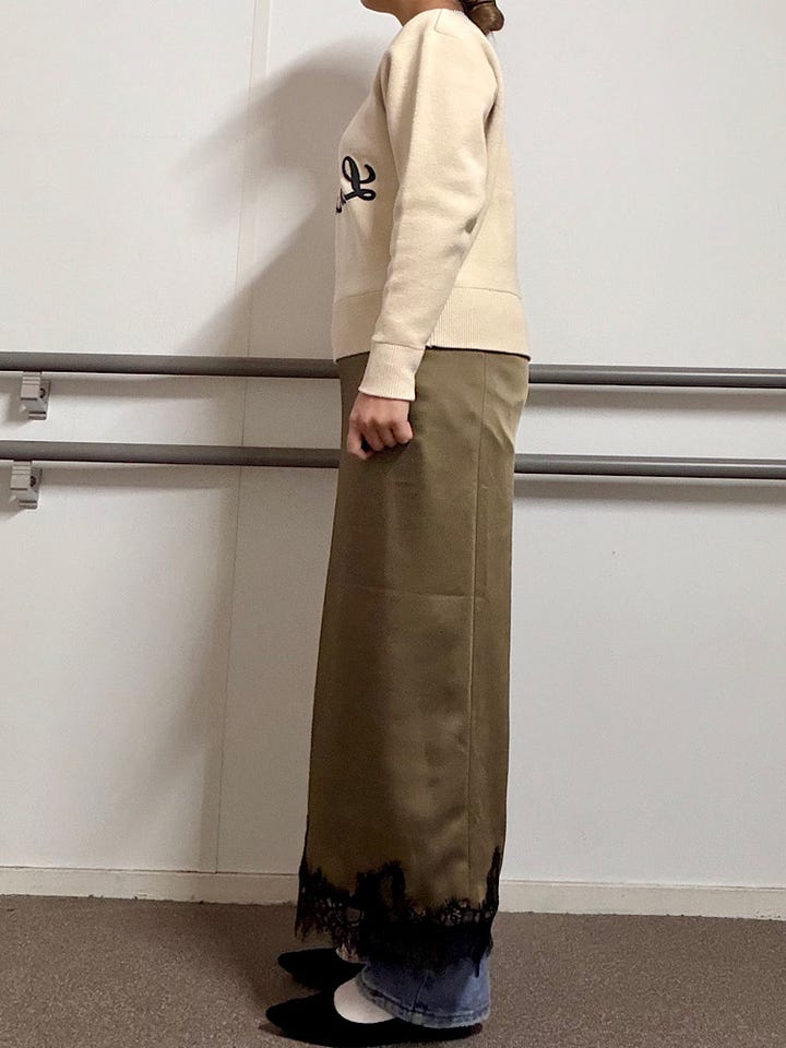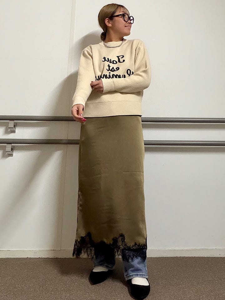 【素材感・着心地】光沢感がありつるんとしたサテン素材を使用。トレンド感のある華やかなランジェリースカートで、裾にレースデザインを施し女性らしい印象に◎