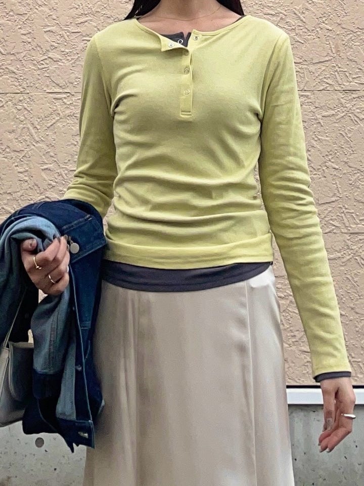 1枚でインナー使いもしやすく、他の色と2枚重ねて着用しても可愛い。