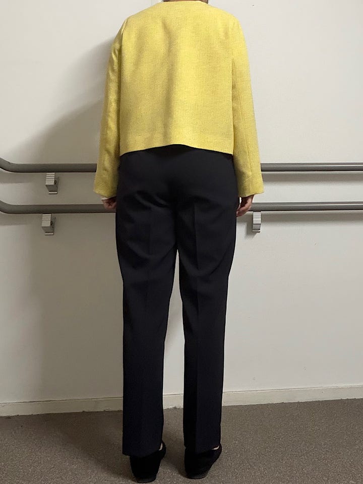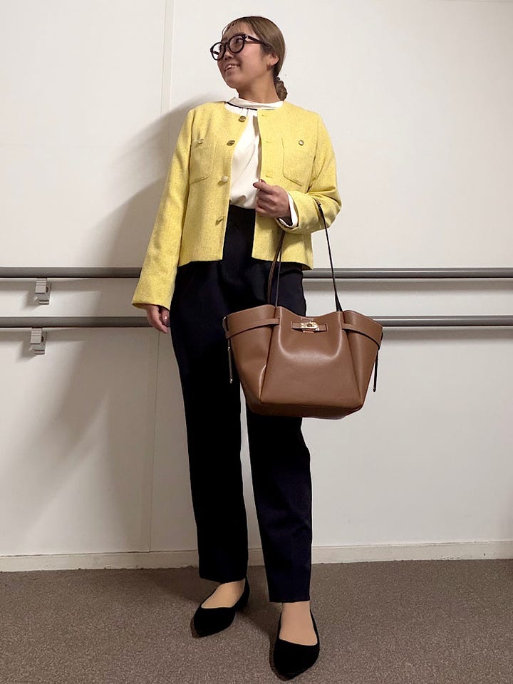 【素材感・着心地】ポリエステルベースの厚手すぎない素材感。凹凸感のあるツイード見えする生地に、ゴールドボタンがアクセントのジャケット♪短丈なのでパンツやスカート、ワンピースなどアイテムを選ばずに着回せる一枚です!