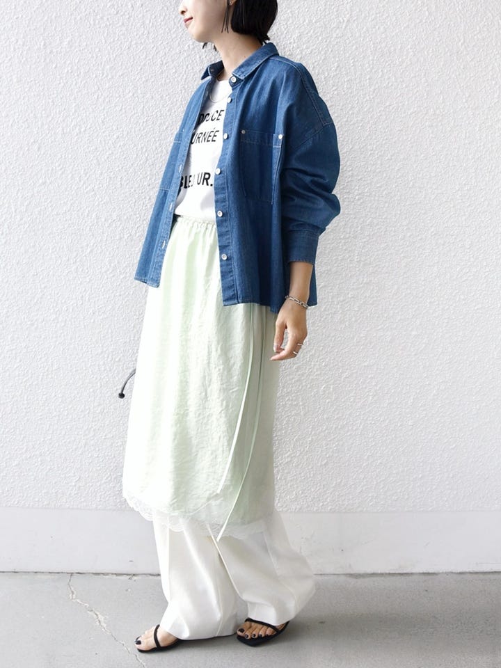 サイズ感:ゆったりとしたシルエットで、デニムやワイドパンツの上に重ねても窮屈感がなく、すっきり合わせられます。サイドの紐でウエスト周りのニュアンスを微調整できるので、合わせるボトムスの厚みに合わせてバランスを変えられるのが◎