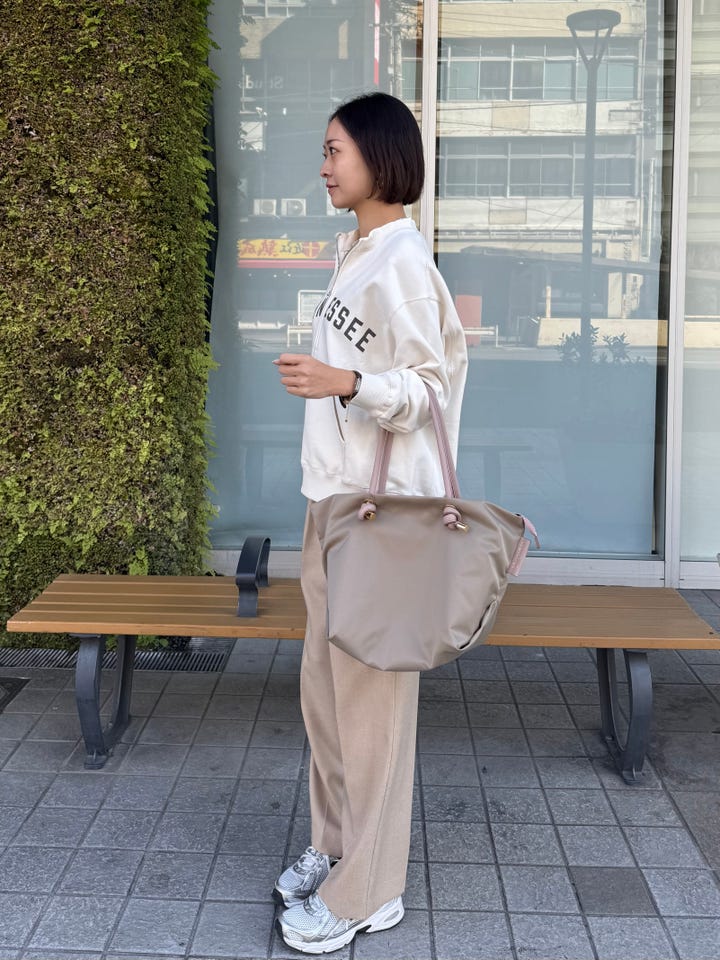 サイズ感・着心地:ヴィオラドーロのナイロンバッグ。持ち手はしっかり革になるのでよれずに長く使えます。本体の素材はナイロンなので雨や汚れを気にせずに使えるのも嬉しい!ベージュとくすみピンクのバイカラーが大人可愛い!