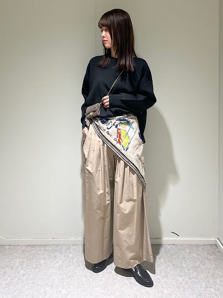 ギャザーが細かく入っていて程よいボリューム感のあるワイドパンツです。生地は薄手なので夏でも着用できます。シンプルなコーディネートにはトレンドの大判スカーフをアクセントに巻くと華やかになりおすすめです!