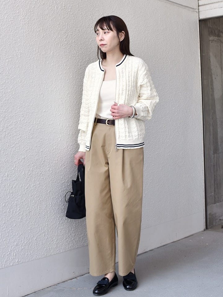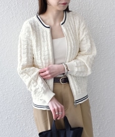 素材感・着心地:レース調の編地が立体感のある、軽やかなニット生地。ほんのりとした透け感が涼しげな抜け感のある雰囲気です。