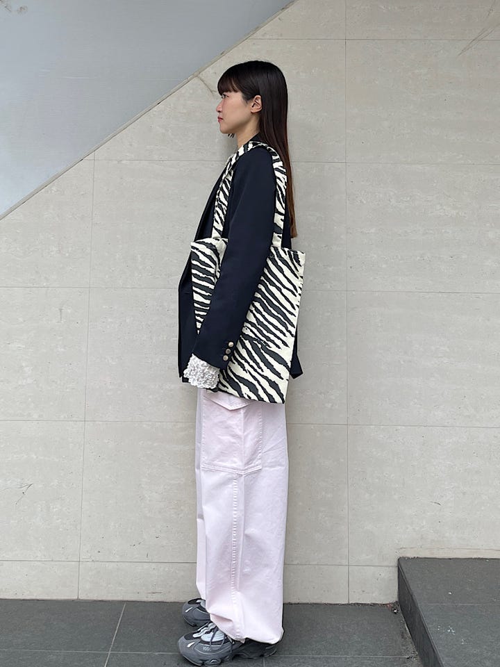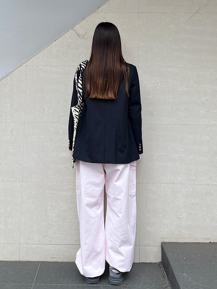ウエストと裾は紐で絞れるデザインです。ボリューム感も程よく、バランス取りやすいです。淡いカラーがカジュアルさを軽減してくれます。