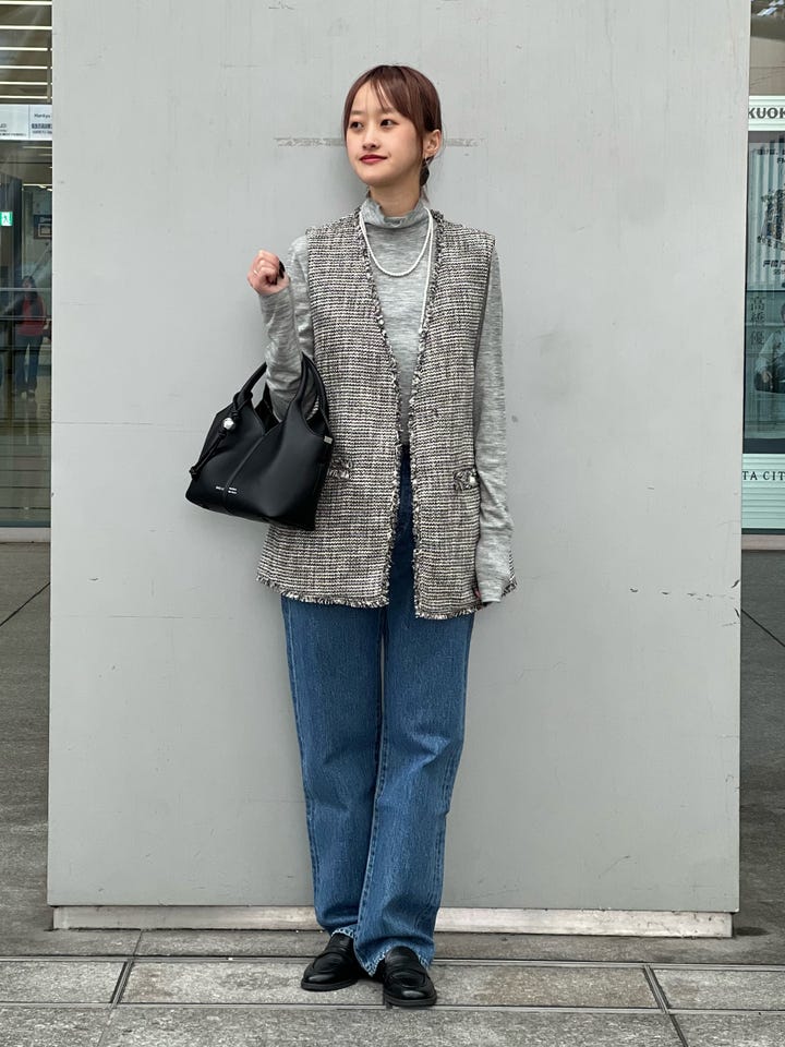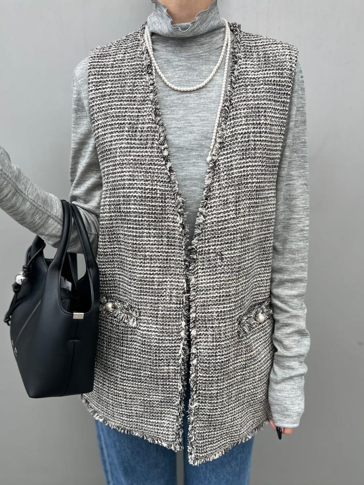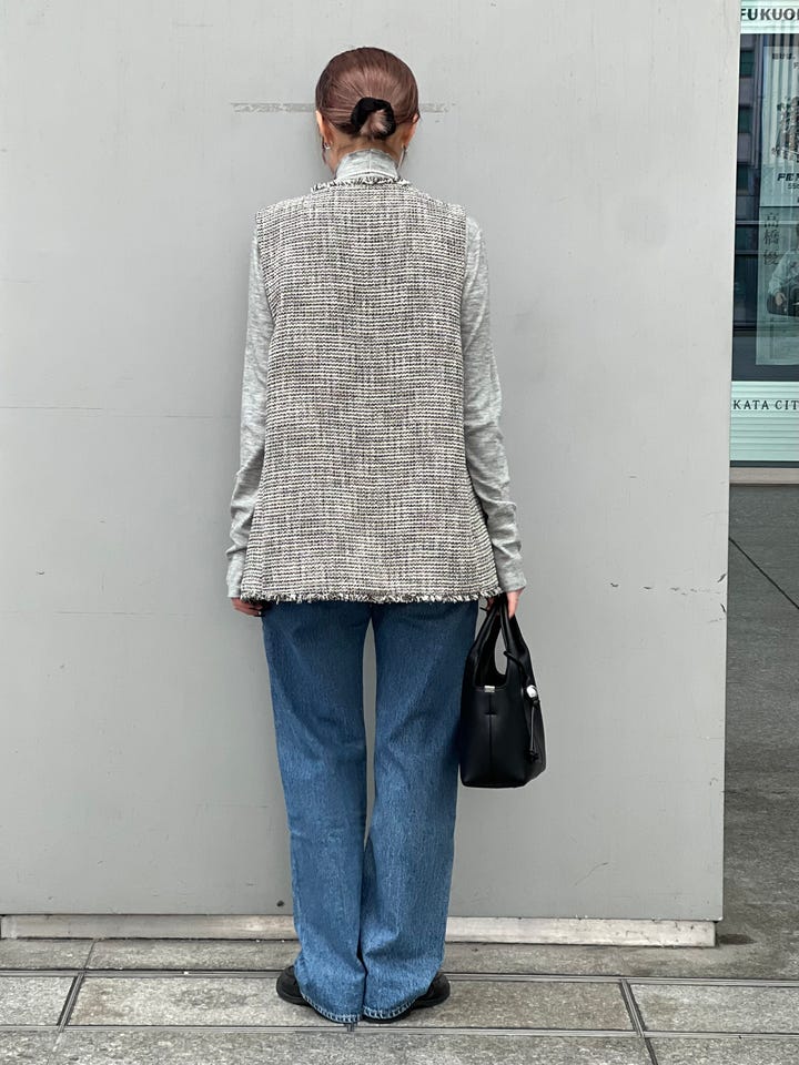 サイズ感: ツイードジレはカジュアルに普段でも着回せます◎深めのVあきと、アームホールも広めの作りなので、ゆったりしたデザインのトップスでも着心地抜群◎セレモニーから普段使いと幅広く対応しています。(卒業式・入学式・学校行事・七五三・会食など)