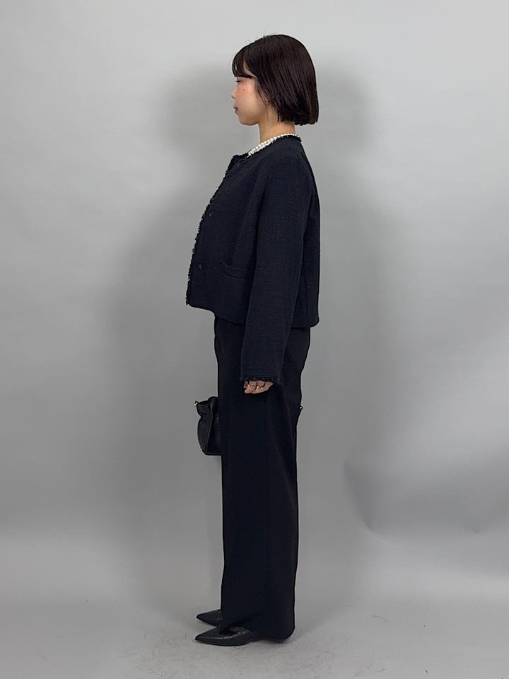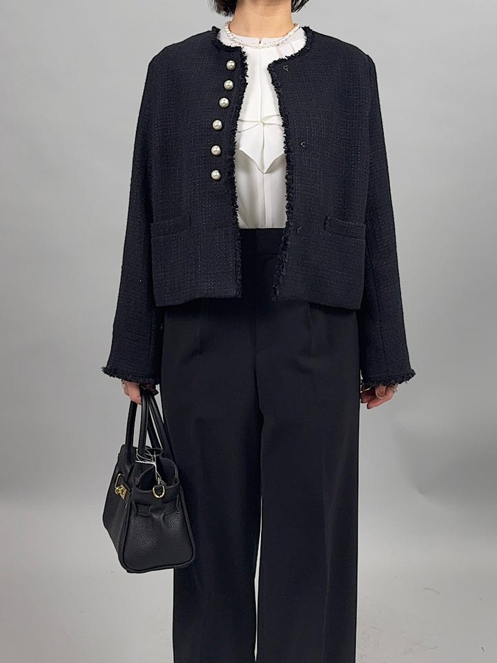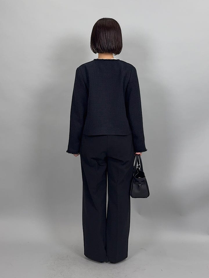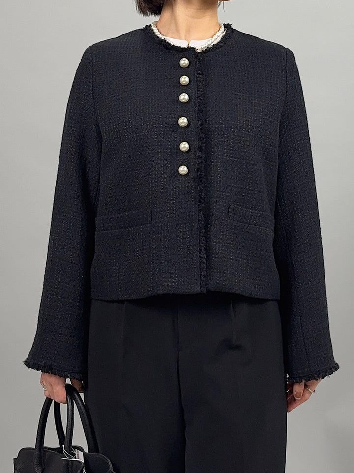 丈夫で立体感のあるツイード素材。丈夫ですがやわらかく軽やかな着心地です◎ホック開閉なので、開けた時もすっきり綺麗に着ていただけます。パールボタンが綺麗なので、アクセサリーなしでも華やかに合わせていただけます。36サイズで身幅もすっきり着れました。