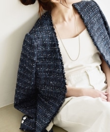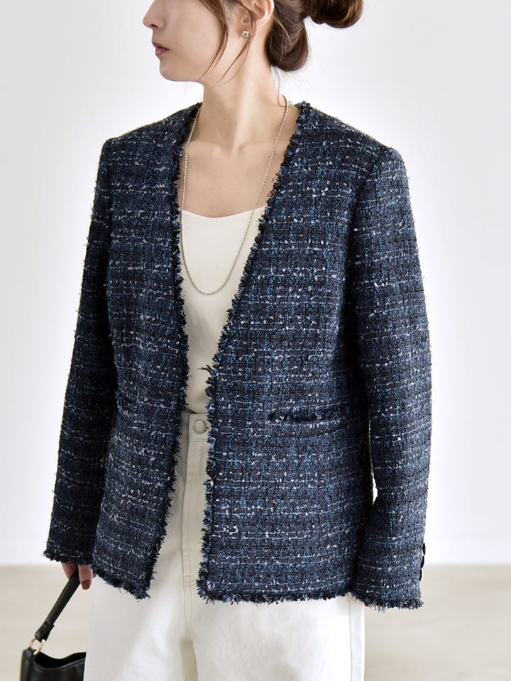 ネイビーツイードジャケットを主役に、白のワイドパンツで抜け感を出した上品カジュアルスタイル。