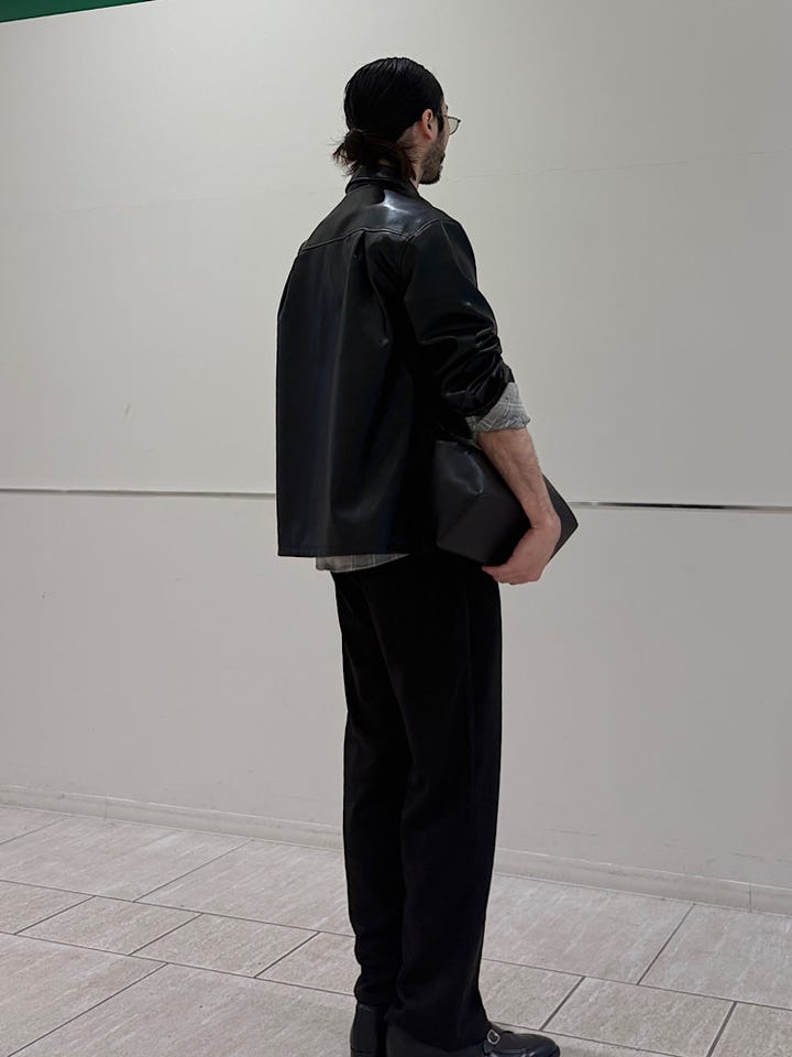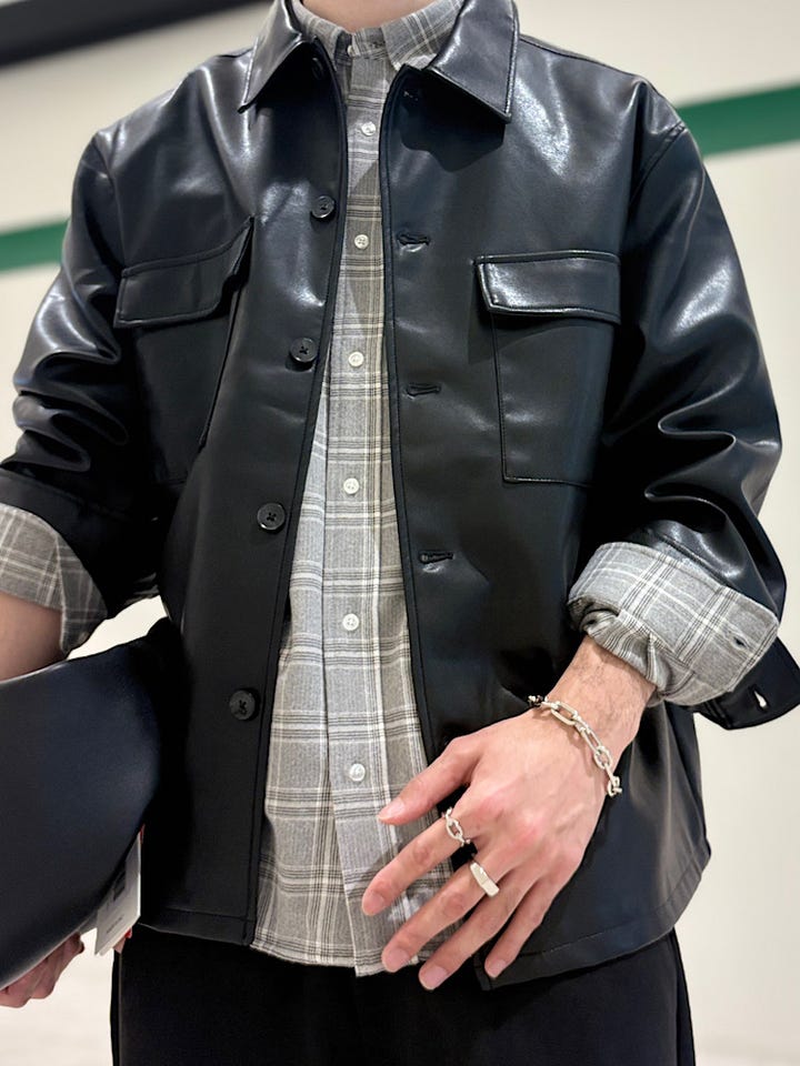 合皮ですがレザー見えするシャツジャケット。総裏地。身幅がややゆとりありのサイズ感。