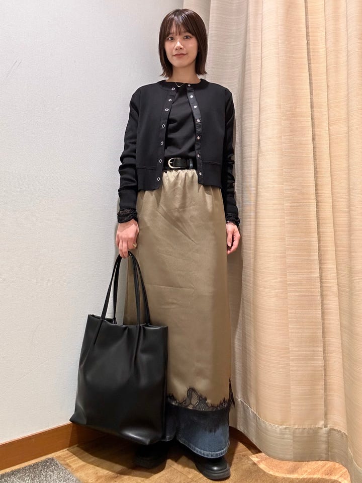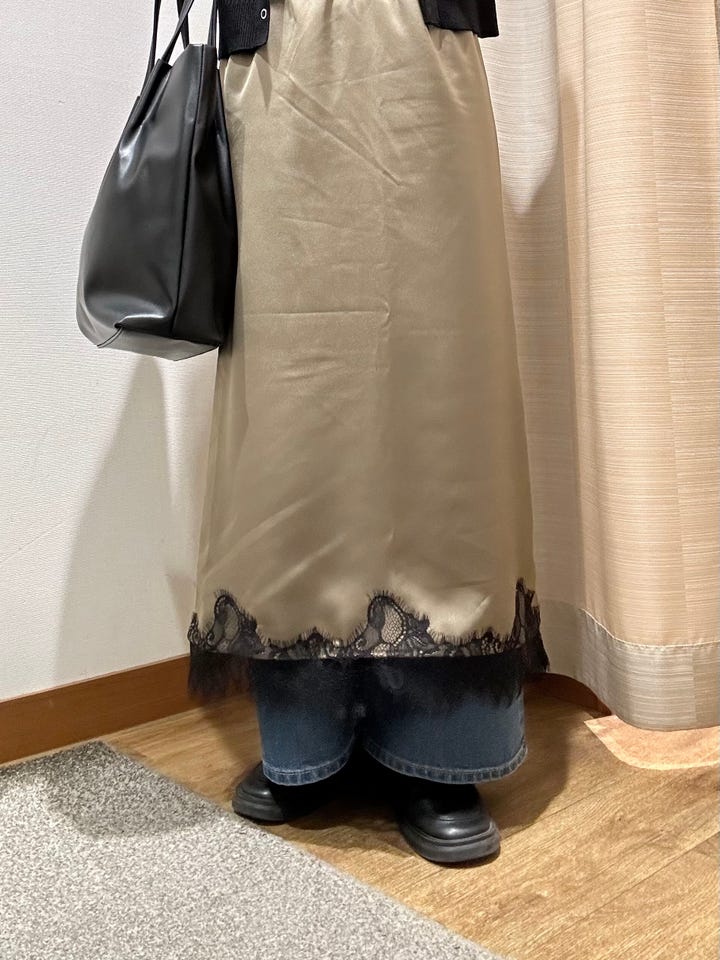着心地:ウエストゴムで楽に履いていただけます。今期流行りのランジェリースカートで一枚着でもレイヤードスタイルでも活躍してくれます◎