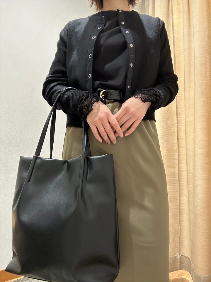 着心地:シンプルなドットボタンのカーディガンです。短めな丈でどんなボトムスとでも相性がいいです!