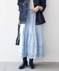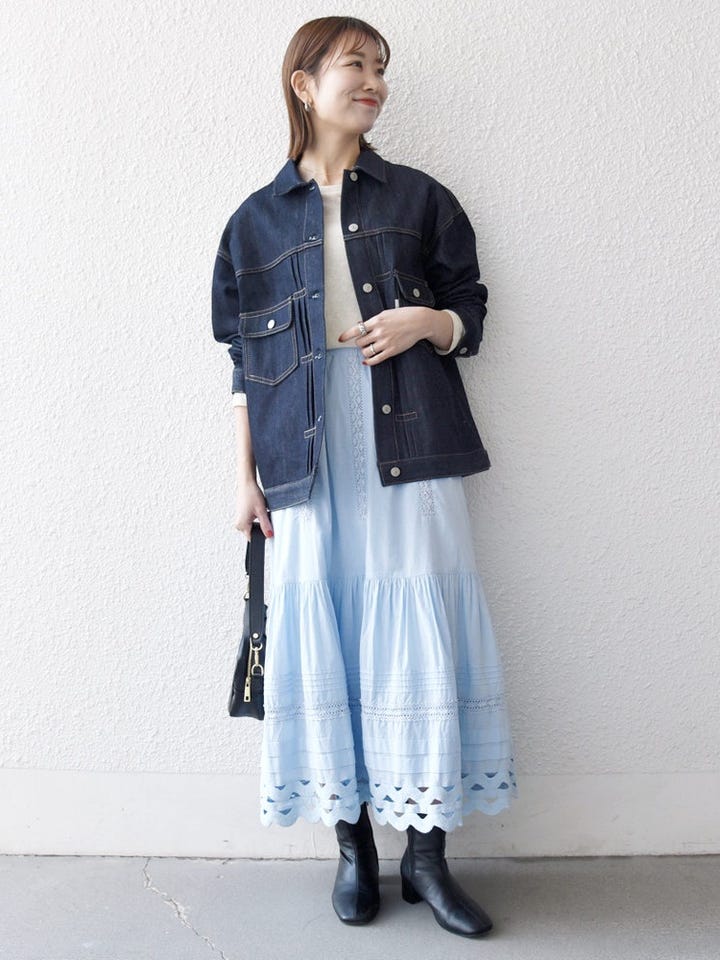 甘めスカートもデニムに合わせることで、カジュアルに着やすくなります◎
