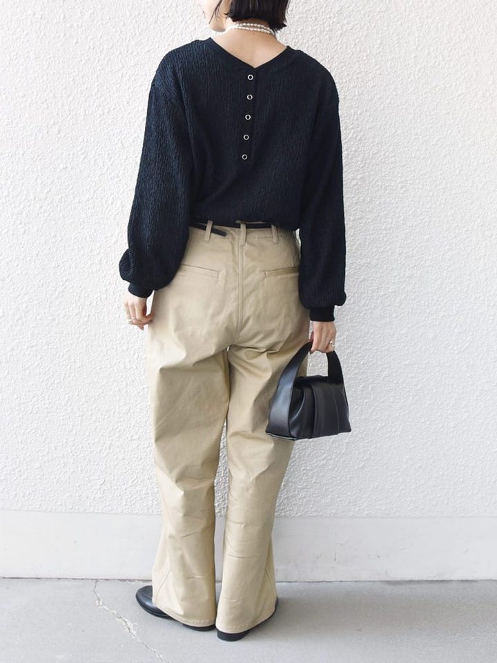着心地:シワになりづらく、ストレスフリーな着心地。前後2WAYで着用可能なので、気分やコーディネートに合わせて変えられるのも◎