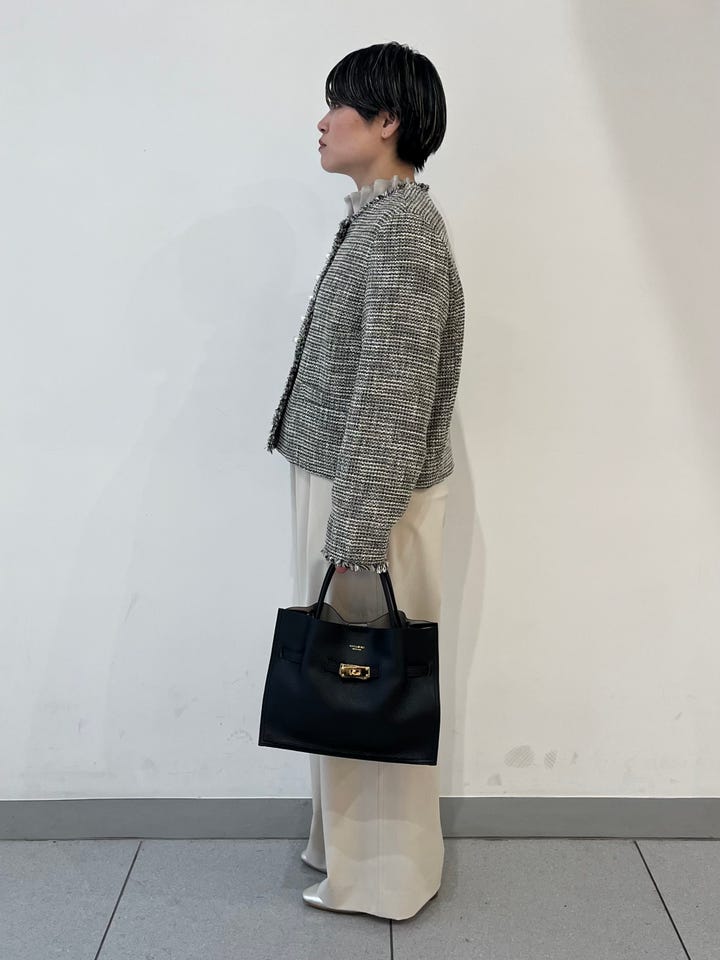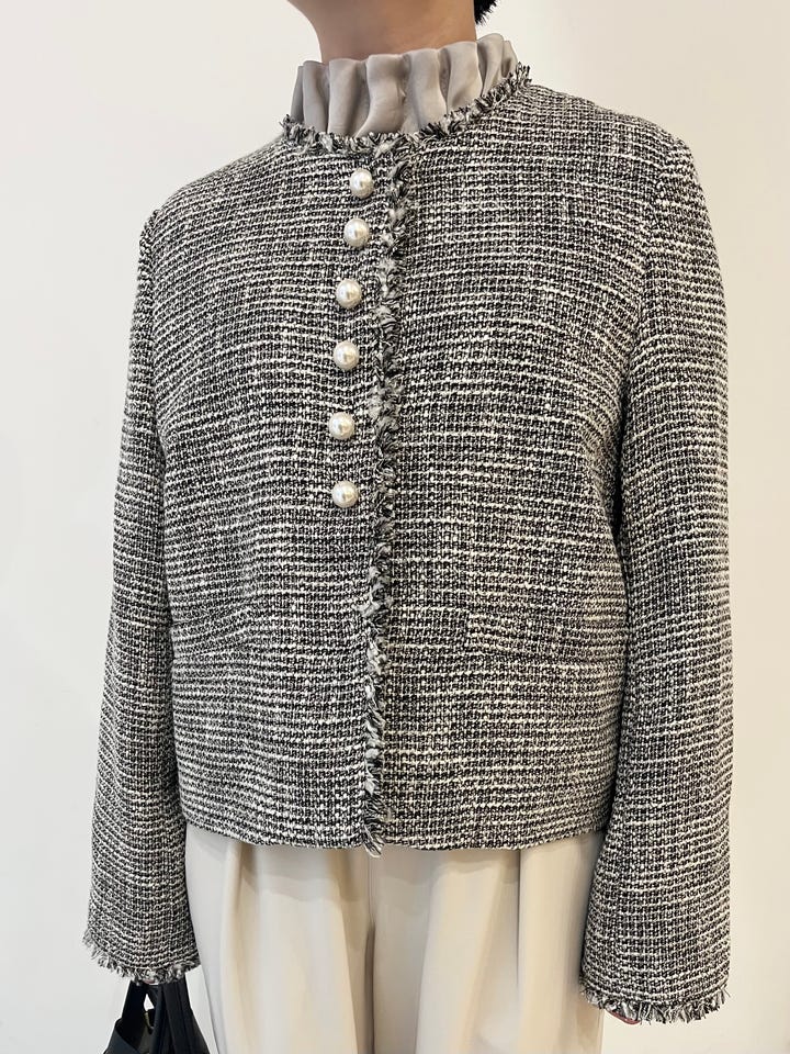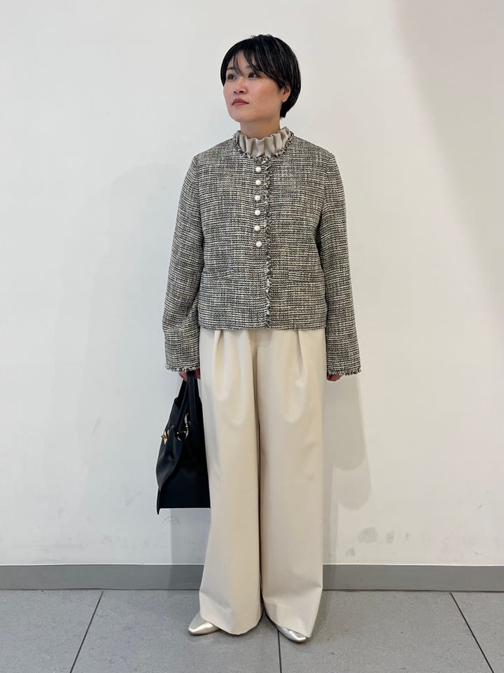 着心地:軽くて柔らかいツィード生地なので、長時間の着用でも疲れません。大ぶりのパールモチーフのボタンがアクセサリーいらずで華やかさが出ます。