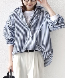 〔ONE SIZE〕〈手洗い可能〉無地 / ストライプ サイド スリット スキッパー コットン シャツ