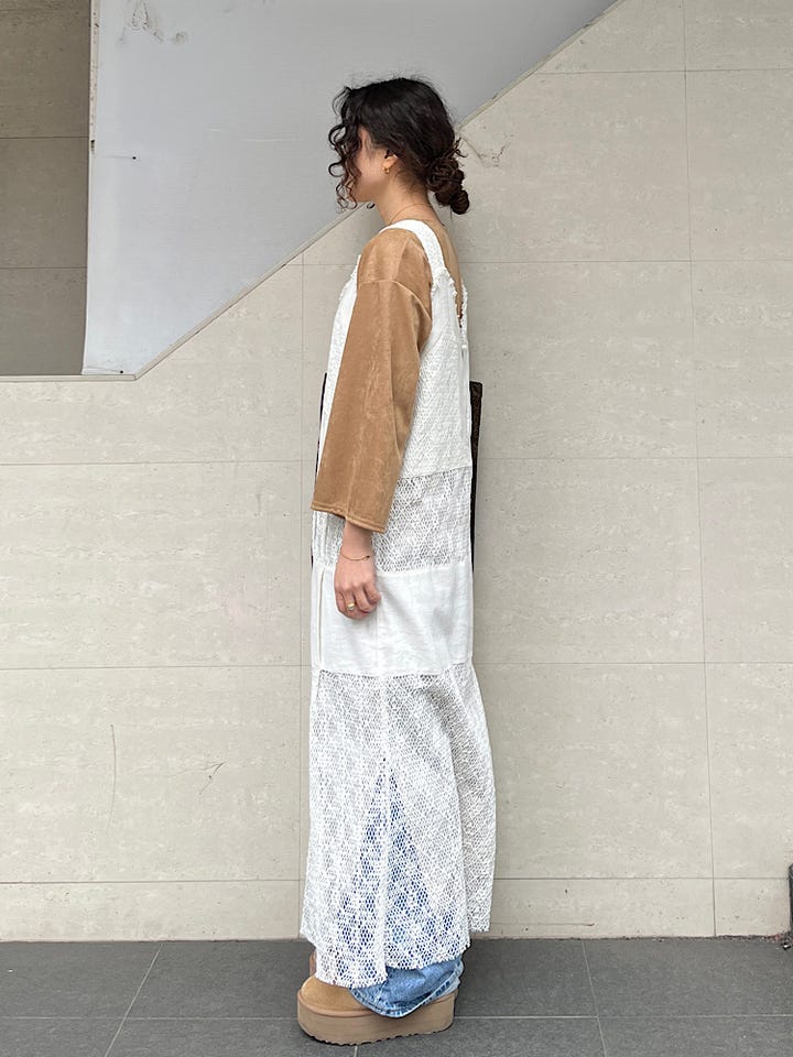 着心地:麻と綿素材を使用したワンピース。程よくゆとりもあり、デニムとレイヤードして合わせています。