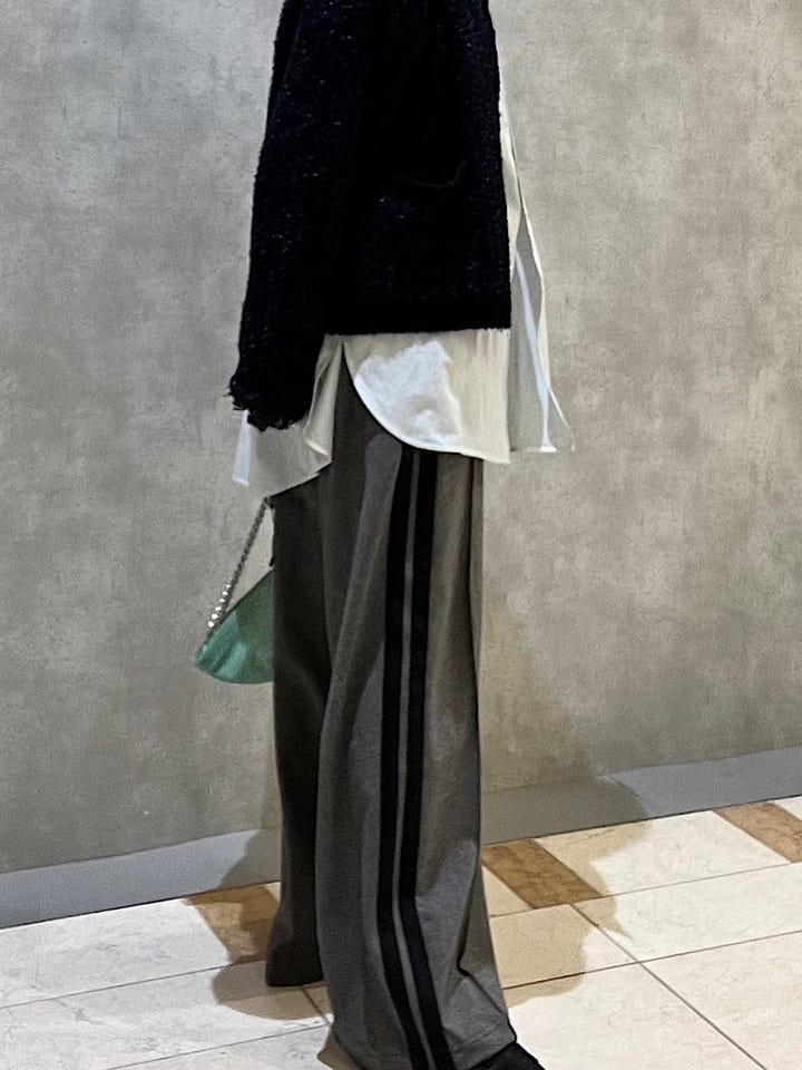 着用感 :ジャージーパンツですがコットン、ポリエステルなので通気性が良くサラッとしています。太さも程よいので綺麗めにも着用出来ます。