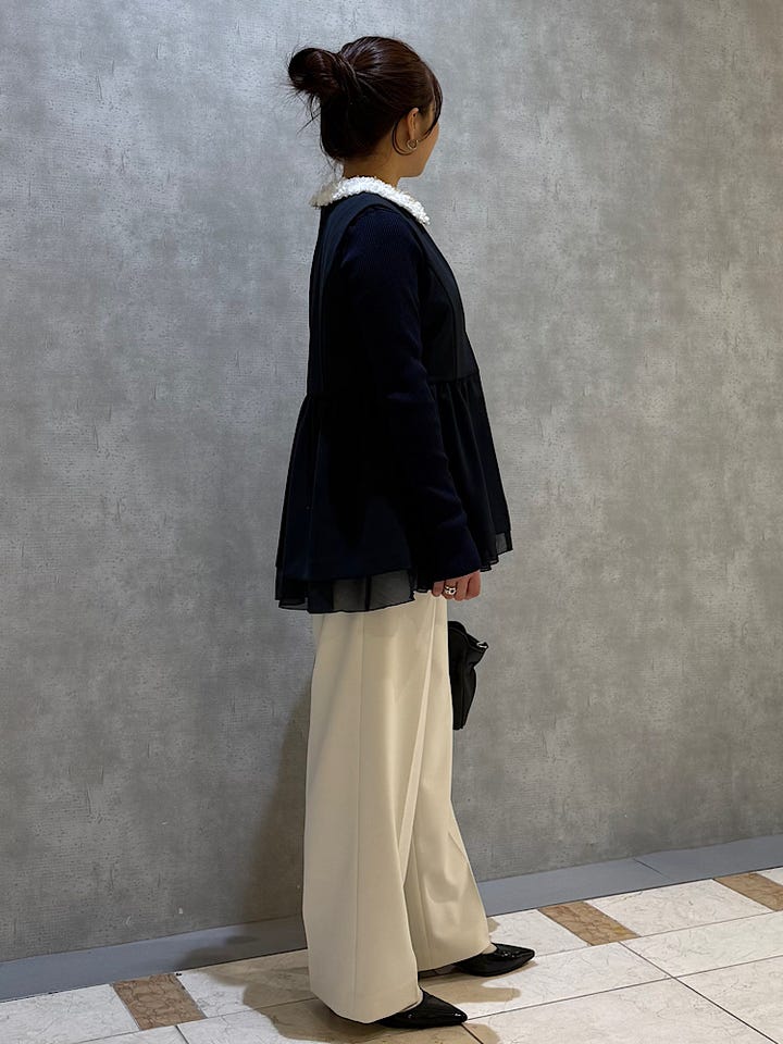 着用感 : シンプルなデザインながらお洒落見えする大人上品なジレです。マットな質感の素材に、裾にはオーガンジーの透け感のある素材を重ねてあり、ネイビーでも軽い印象になります。後丈の方が長めでヒップラインが隠れるのも嬉しいポイントです。