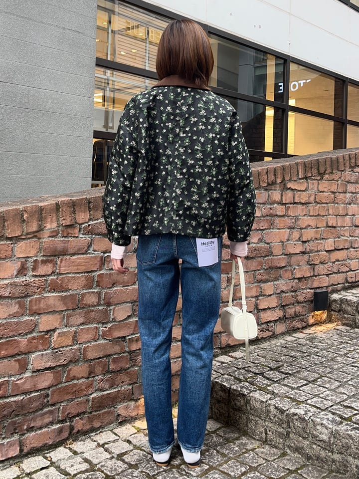 1枚で映える小花柄アウター。丈は短めですが、短すぎず、身幅も程よいゆとり感あるので、合わせやすいです。