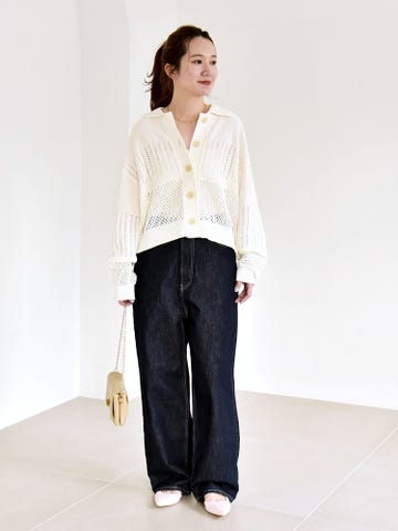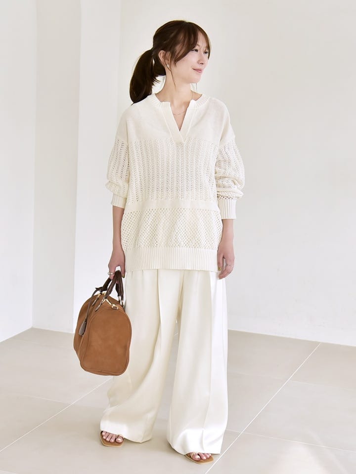 透かし編みニットにワイドパンツを合わせた、柔らかく上品なワントーンコーデ。